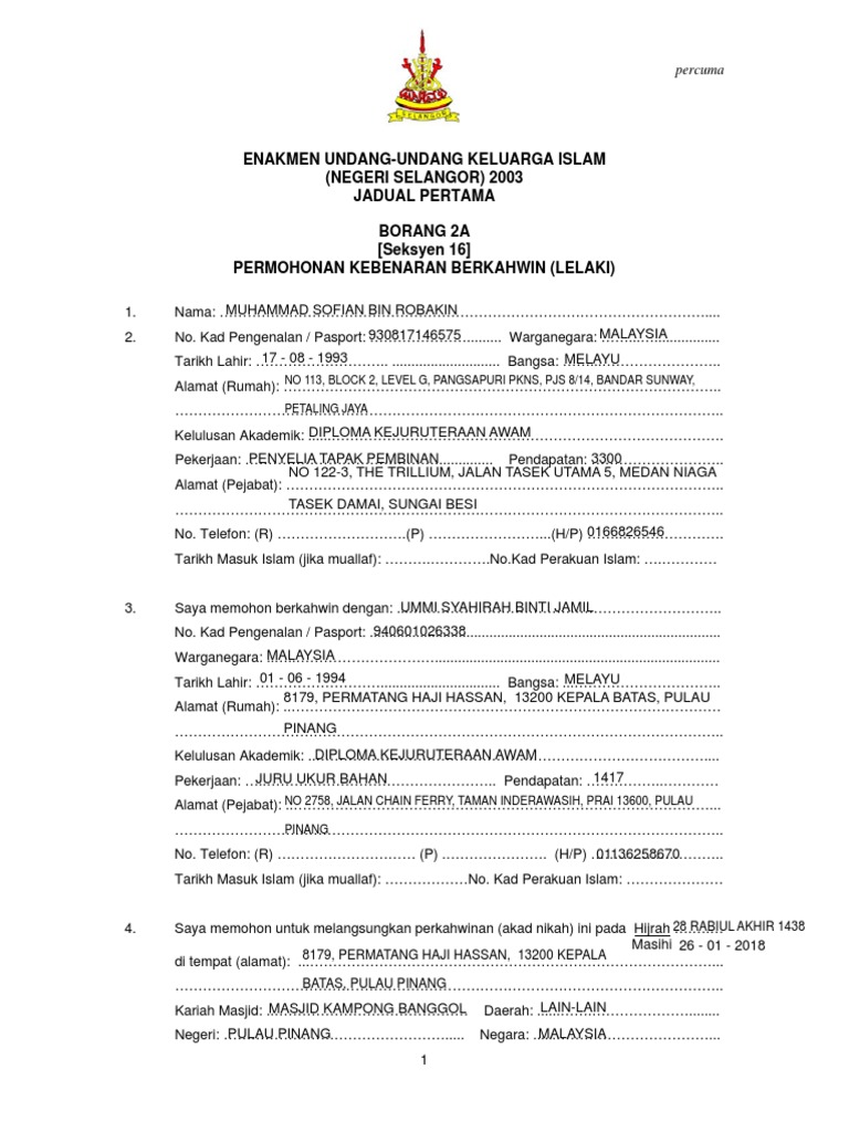 Borang Permohonan Nikah Perempuan Pulau Pinang