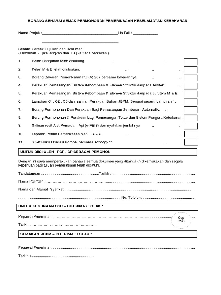 Borang Senarai Semak Permohonan Pemeriksaan Keselamatan Kebakaran