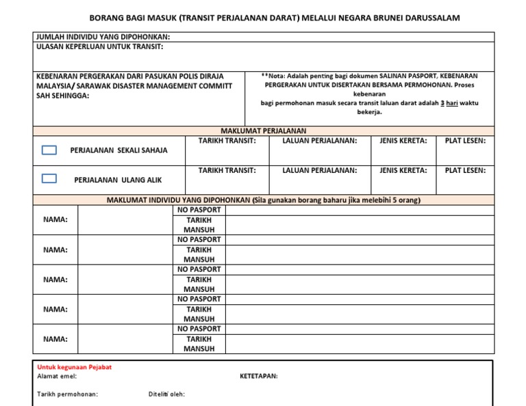 Borang Bagi Masuk Transit Perjalanan Darat Melalui Negara Brunei Darussalam