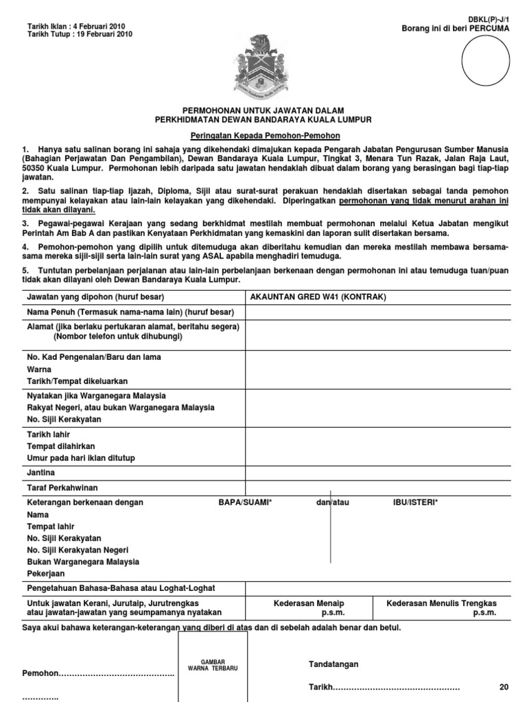 Borang Jawatan Akauntan Dewan Bandaraya Kuala Lumpur Dbkl