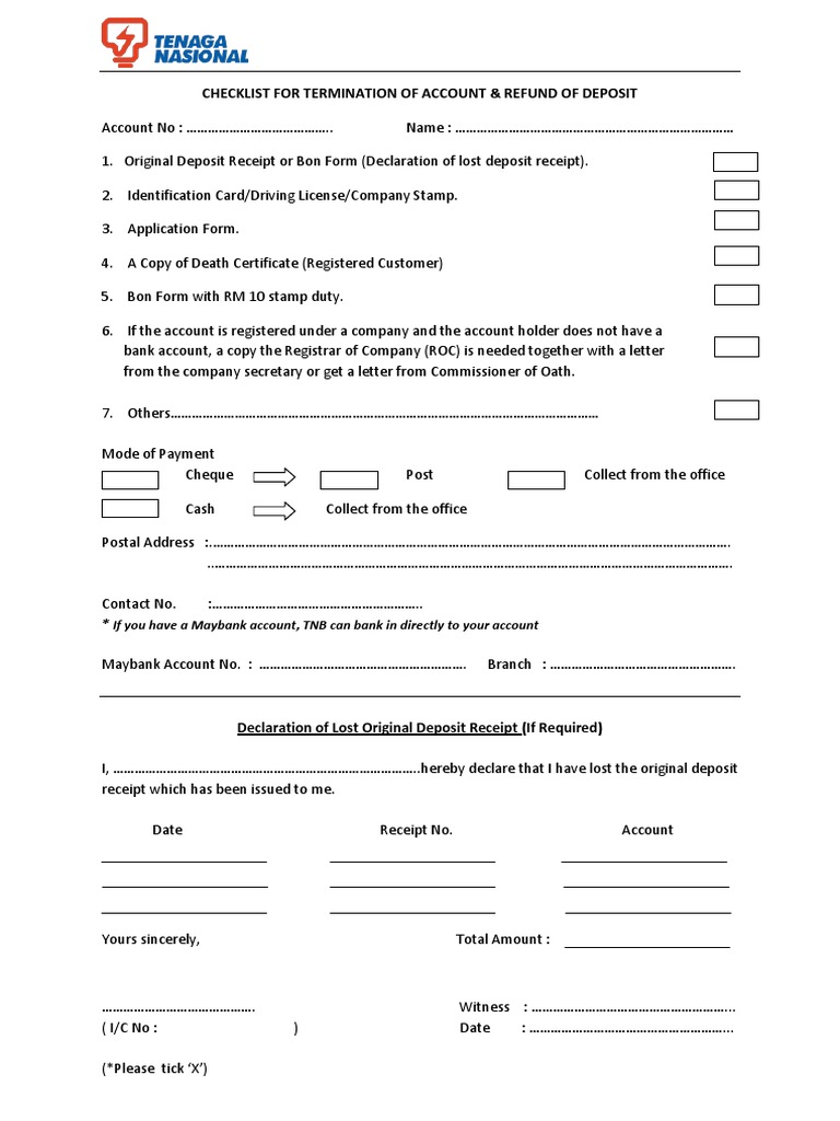 Borang Tnb Checklist Tutup Akaun Receipt Cheque