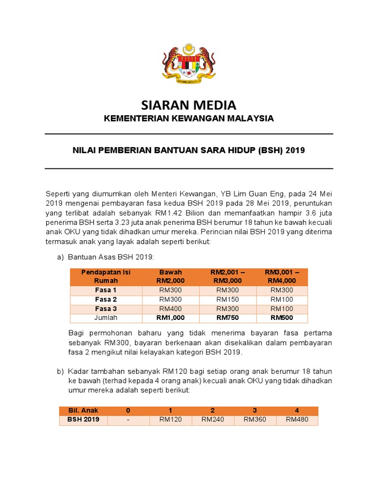 Siaran Media Kementerian Kewangan Malaysia Nilai Pemberian Bantuan Sara Hidup Bsh 2019