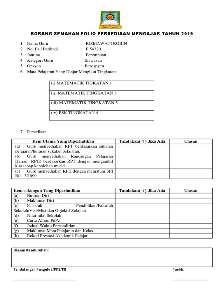 Borang Semakan Folio Persediaan Mengajar Tahun 2019