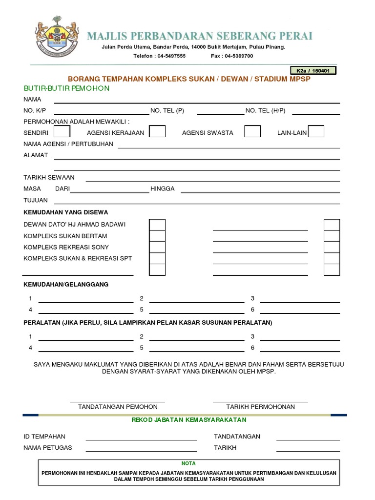 Borang Tempahan Kompleks Sukan Dewan Stadium Mpsp Butir Butir Pem Ohon
