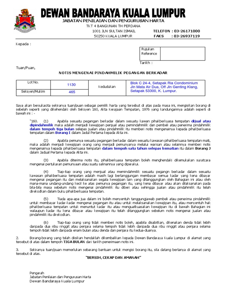 Latest Transfer Akta Kerajaan Tempatan 1976 Borang I Notis Jualan Atau Pindahmilik Seksyen 160 Yang Dipertua No Akaun Cukai Taksiran Pdf Document