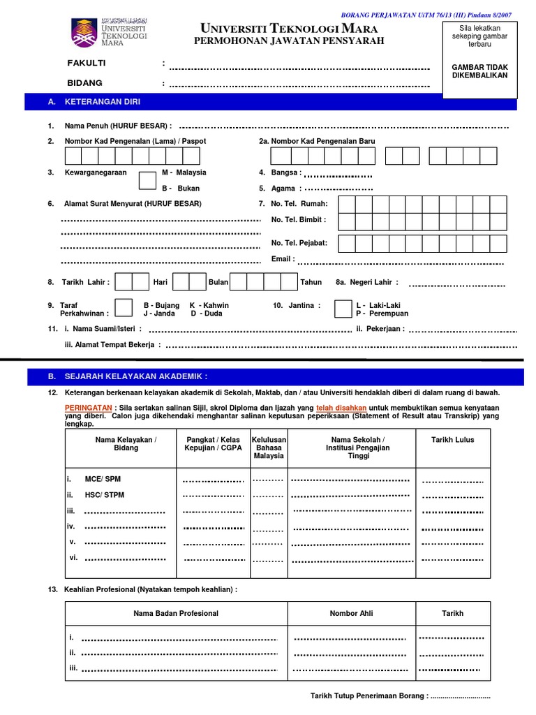 Borang Perjawatan Uitm Uitm Johor