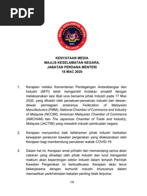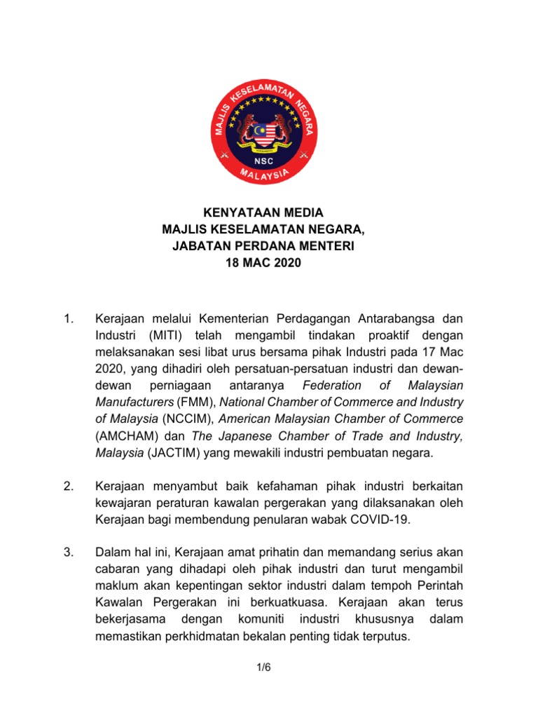 Kenyataan Media Majlis Keselamatan Negara Jabatan Perdana Menteri 18 Mac 2020