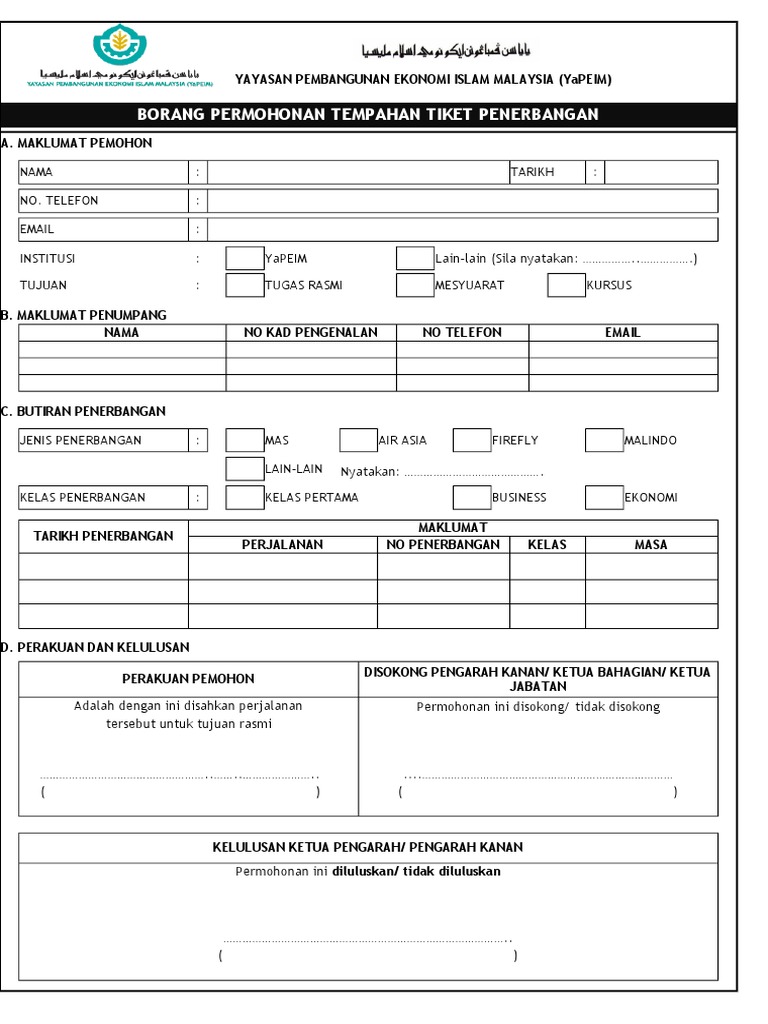 Borang Tempahan Penerbangan Penginapan Yapeim