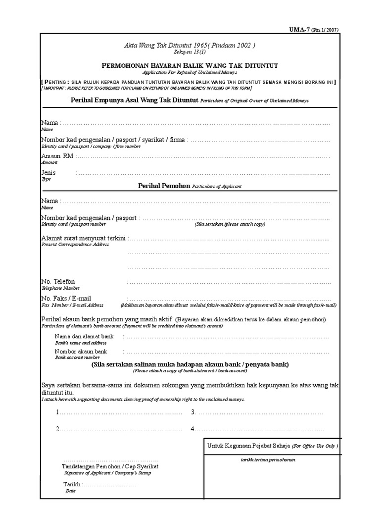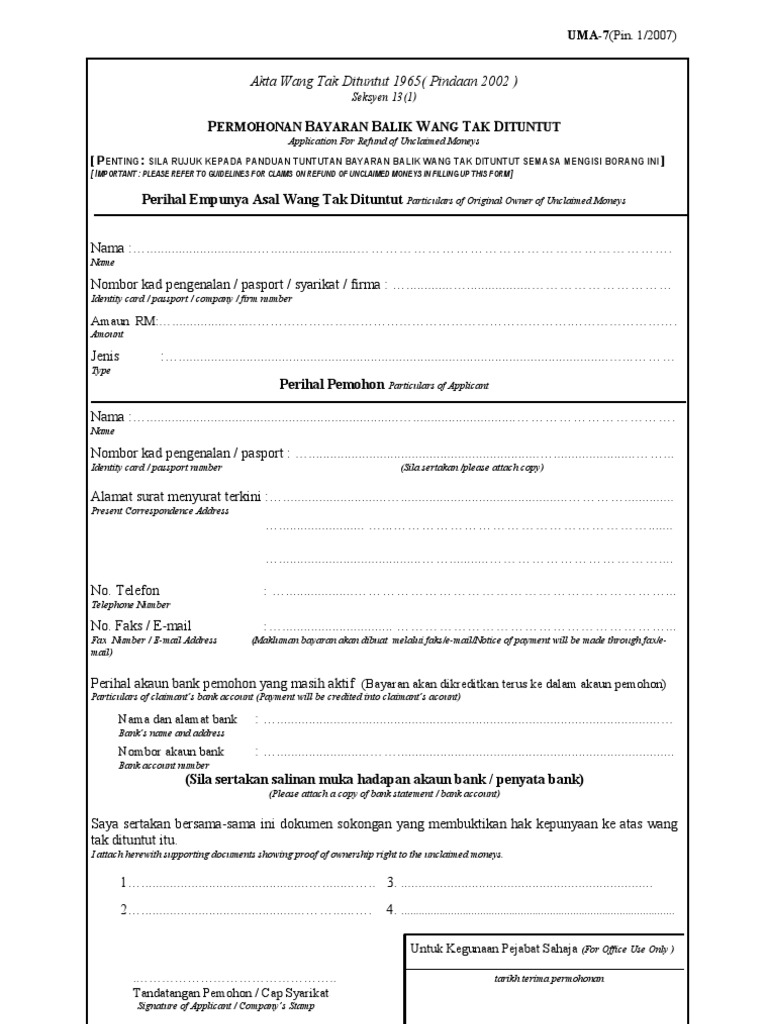 Borang Permohonan Bayaran Wang Tak Dituntut Wtd Uma 7