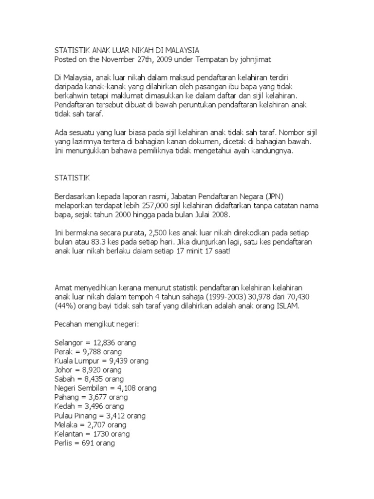 Statistik Anak Luar Nikah Di Malaysia